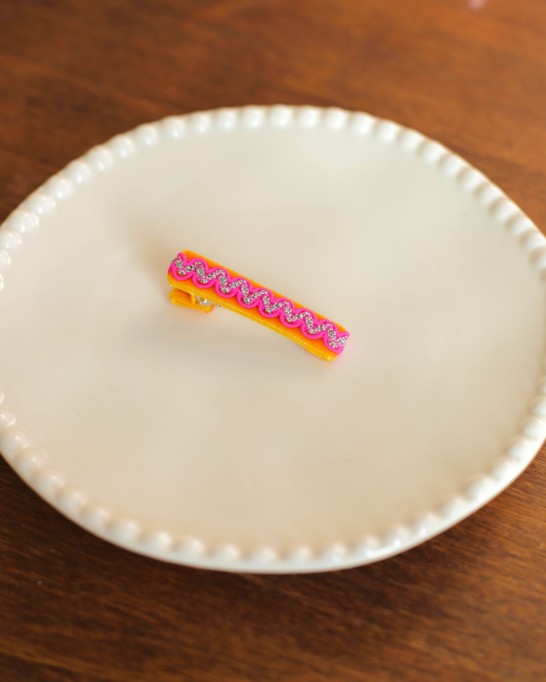 La petite pince Pop, dans sa version Abricot, rose fluo et argenté est une petite pince crocodile argentée recouverte d’un ruban de velours abricot et d’un croquet brillant rose fluo et argenté.