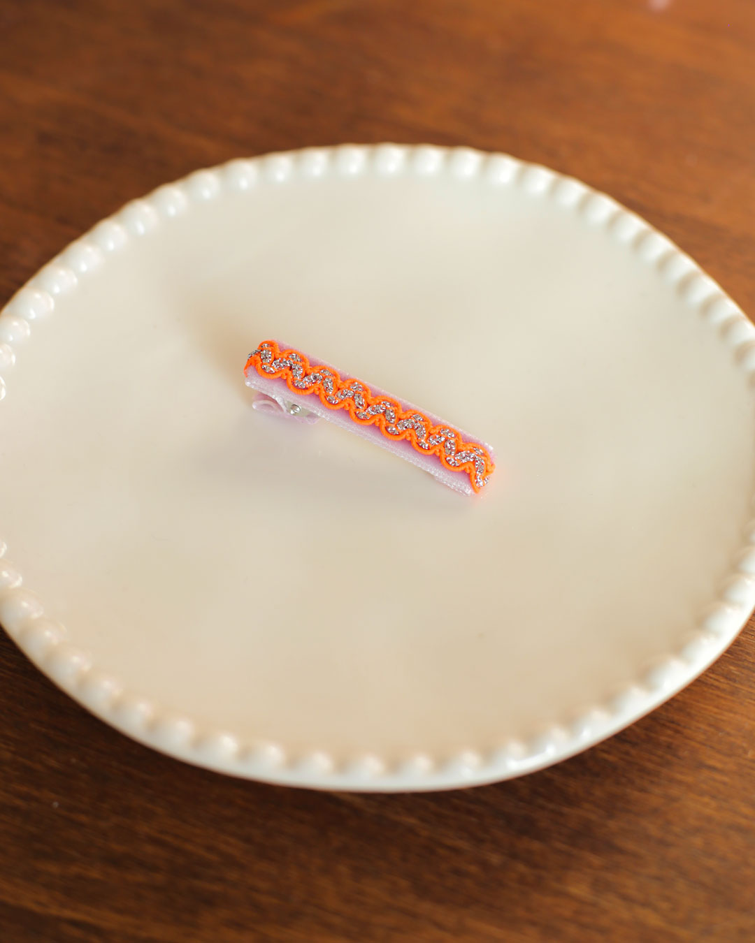 La petite pince Pop, dans sa version Parme, orange fluo et argenté est une petite pince crocodile argentée recouverte d’un ruban de velours parme et d’un croquet orange fluo et argenté.
