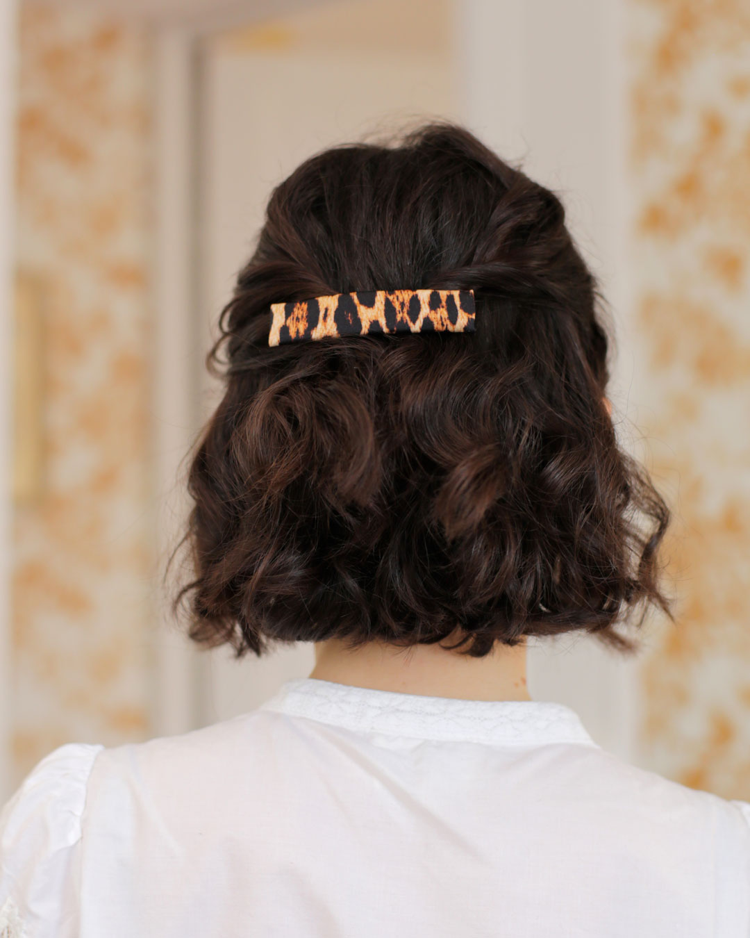 La barrette Hortense, dans sa version Soie léopard, est une barrette rectangulaire confectionnée dans une soie léopard italienne et montée sur une barrette clip (ou French barrette) dorée à l’or fin.