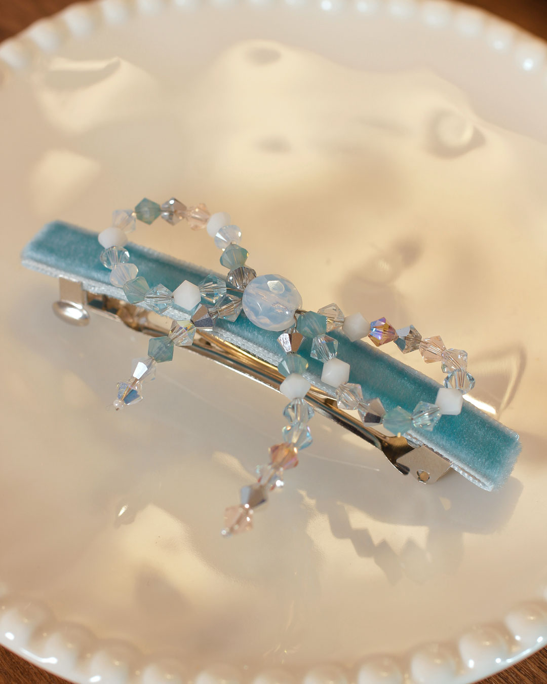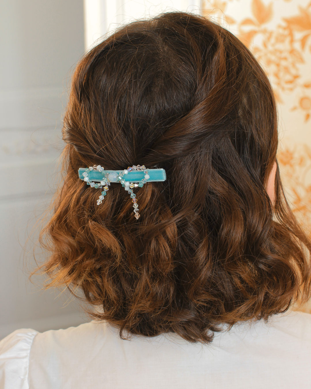 La barrette Sophia dans sa version Bleu céleste est une barrette clip (ou French barrette) argentée, recouverte d’un ruban velours bleu clair et surmontée d’un noeud en perles de cristal européennes de tons bleus, blancs et argentés.