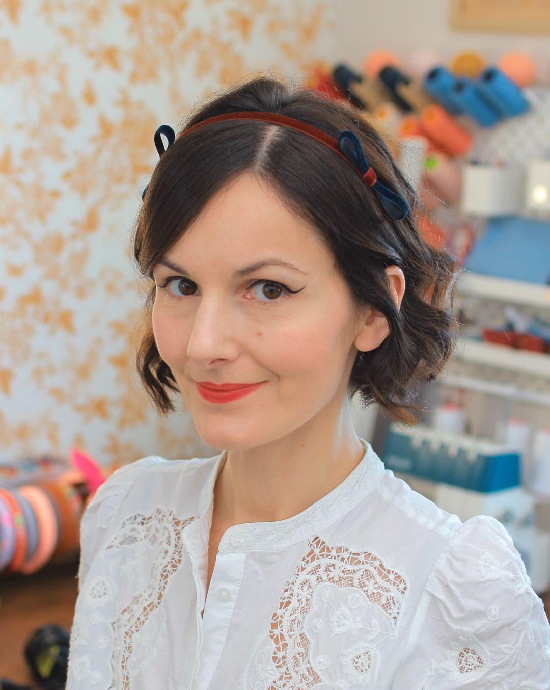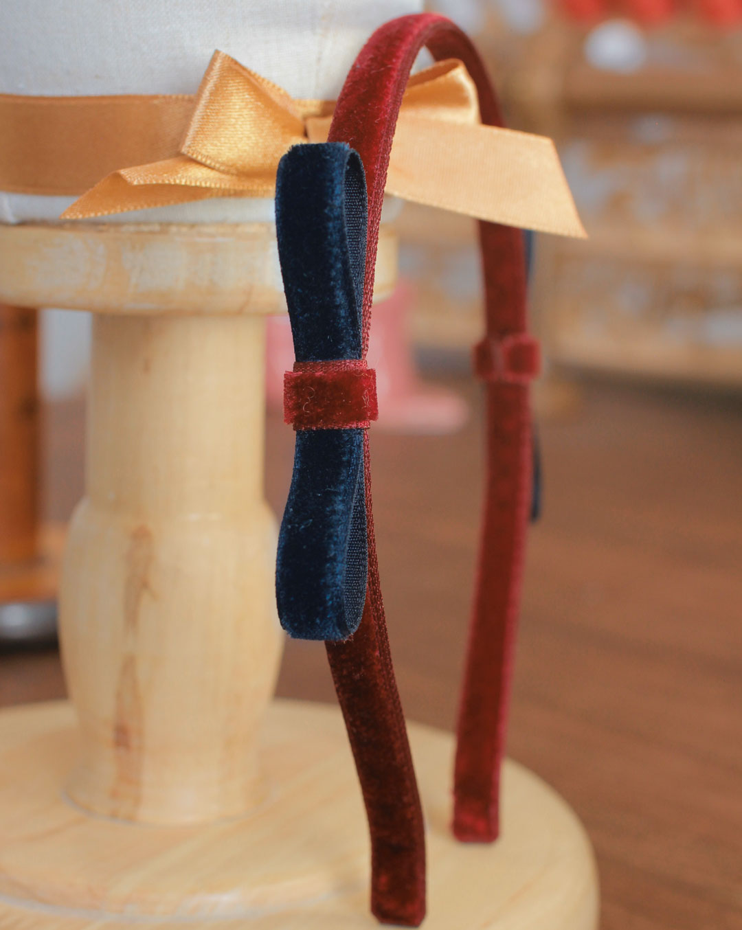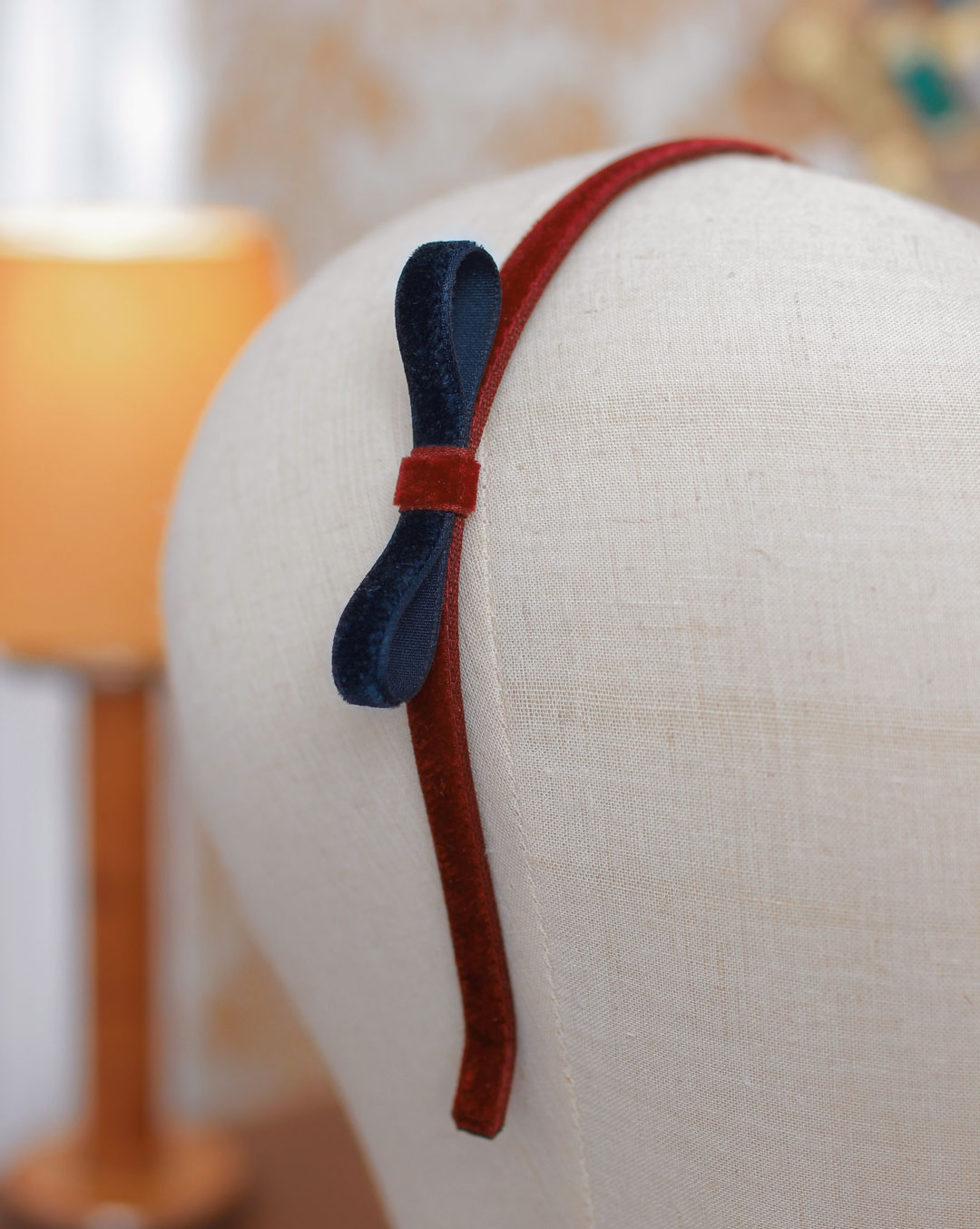 Serre-tête en velours bordeaux orné de deux nœuds en velours bleu marine