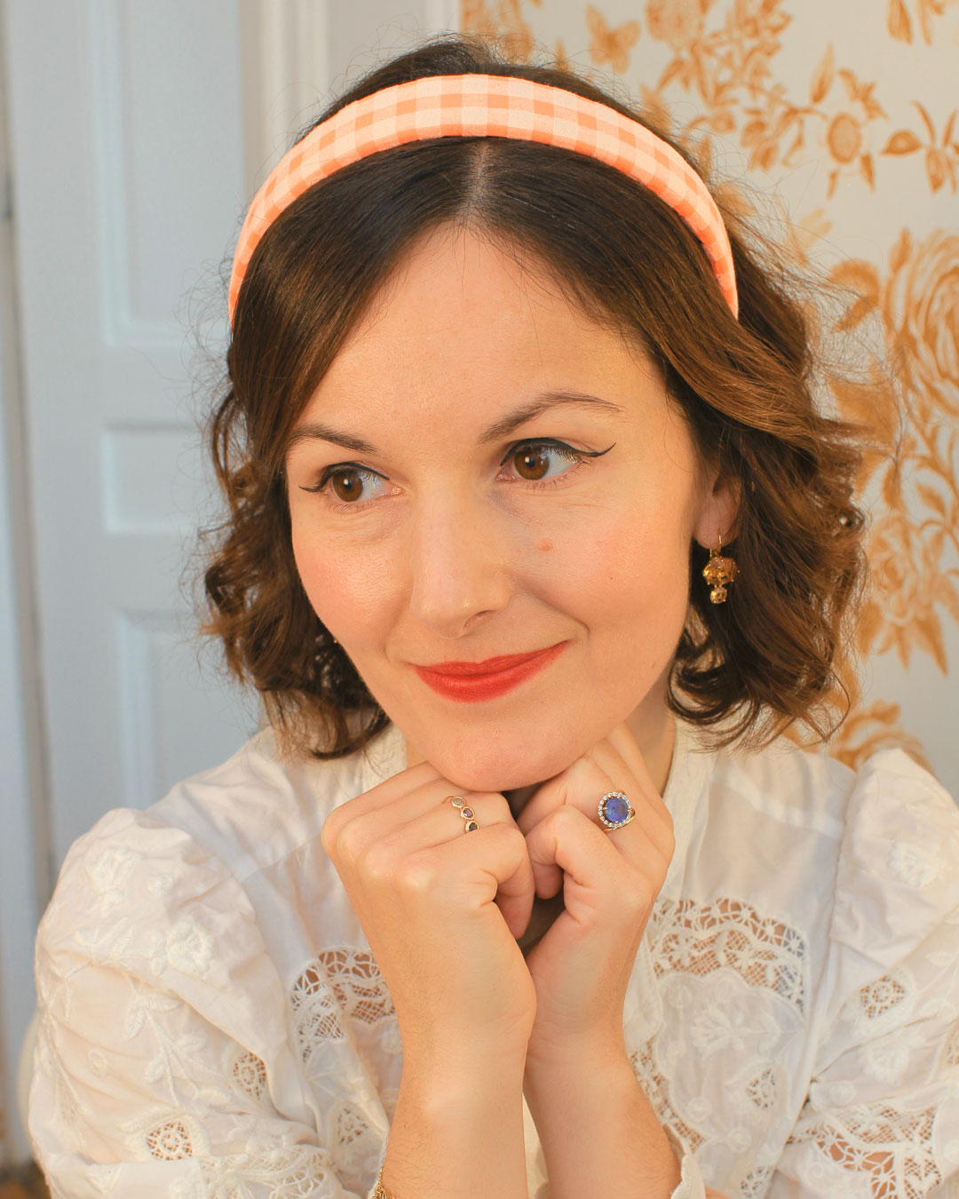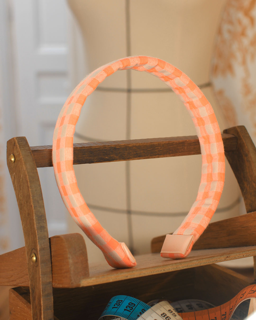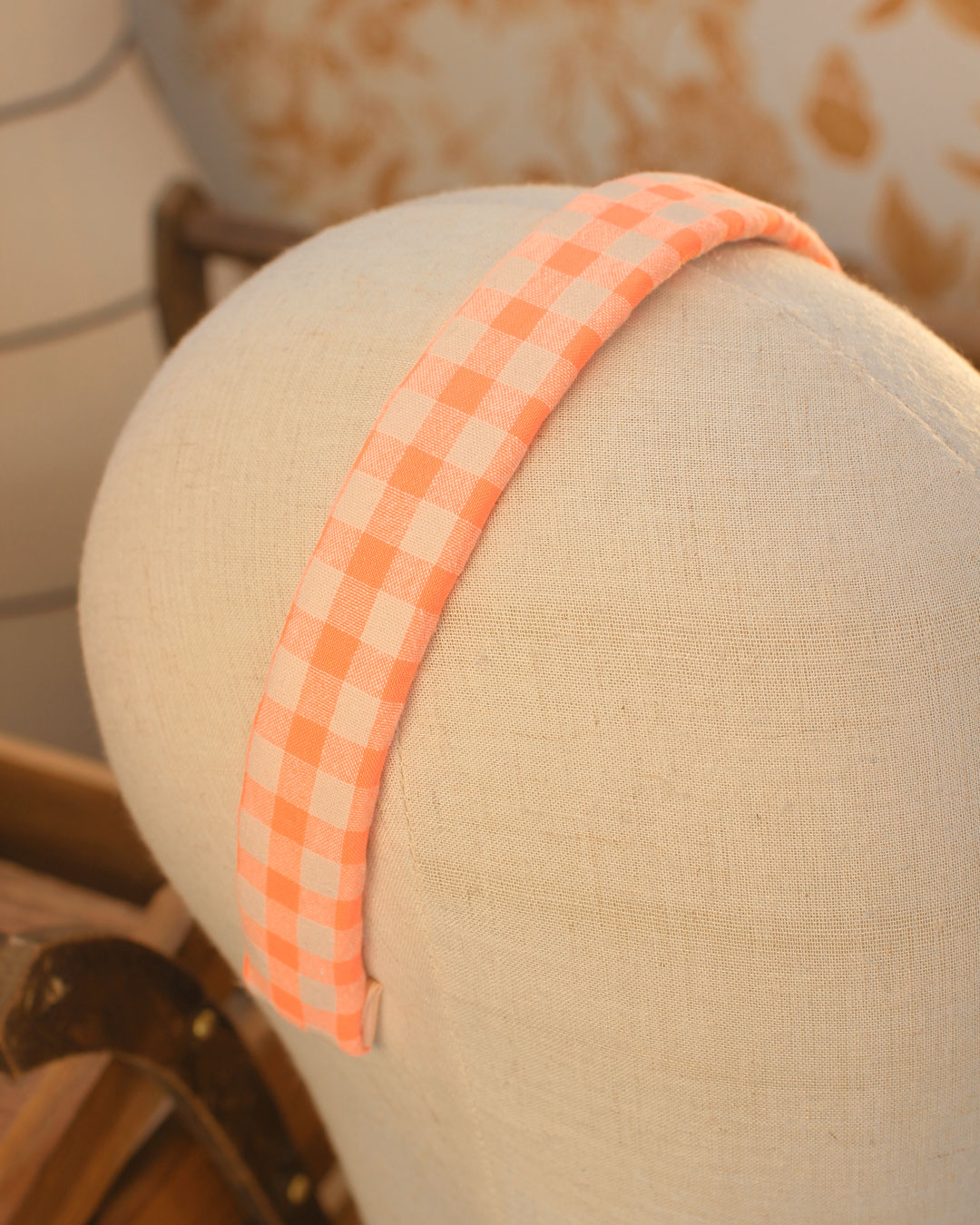 Le serre-tête Alice, dans sa version Néon, ne passe pas inaperçu ! Espiègle à souhait, il est confectionné à partir d’un seersucker orange fluo et nude.