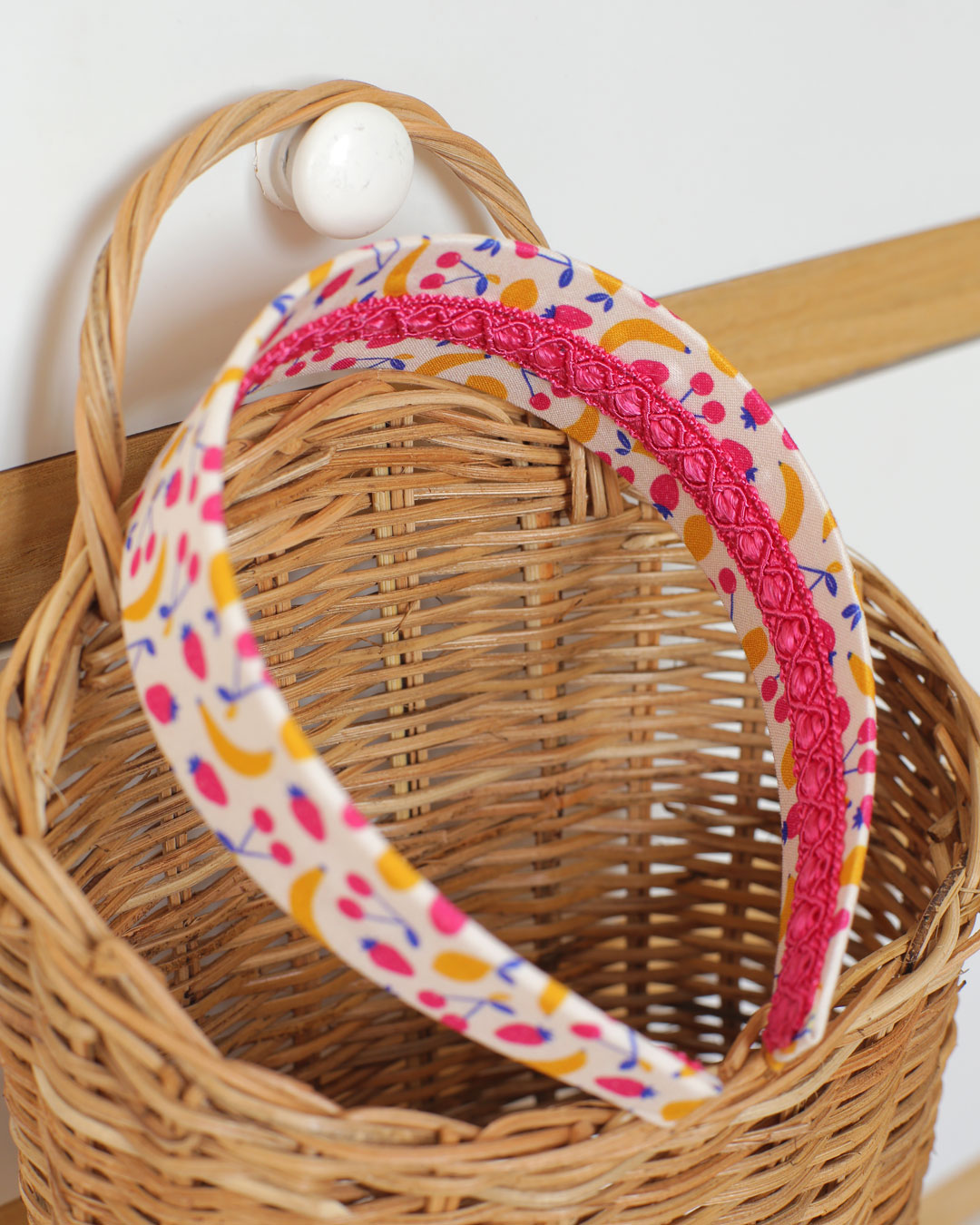 Le serre-tête Ambre, dans sa version Fruits d’été, est un serre-tête large style bandeau, confectionnée dans une pétillante viscose blanche à l’imprimé fruité : fraises, cerises, citrons et bananes dans des tons rose, jaune et bleu.