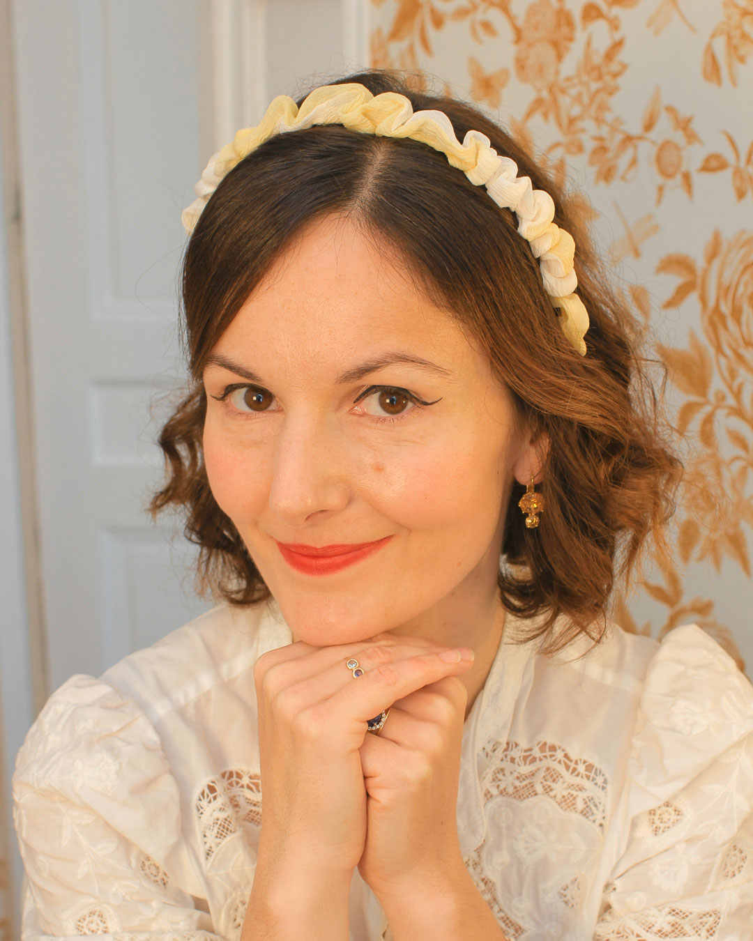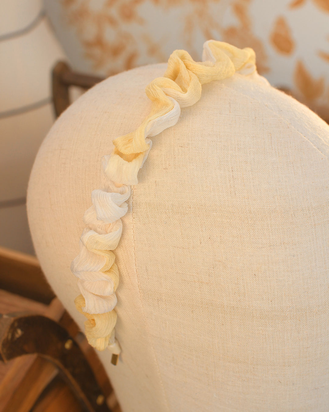 Le serre-tête Chloé, dans sa version Soie Aube, est un serre-tête en soie tie and dye jaune pâle et crème, aérien et évanescent, confectionné sur une structure métallique dorée à l’or fin.