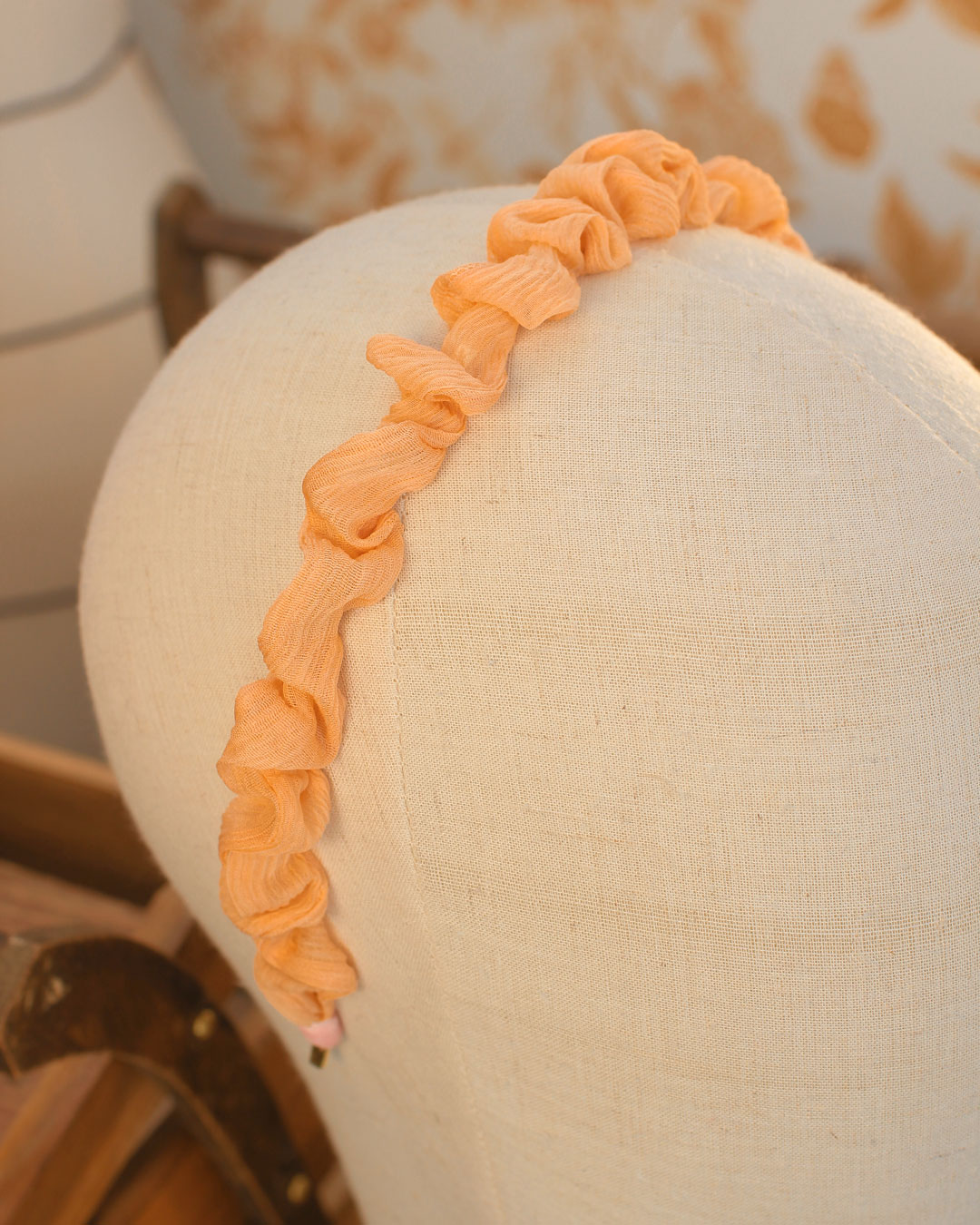 Serre-tête en soie pêche sur structure métallique dorée à l’or fin
