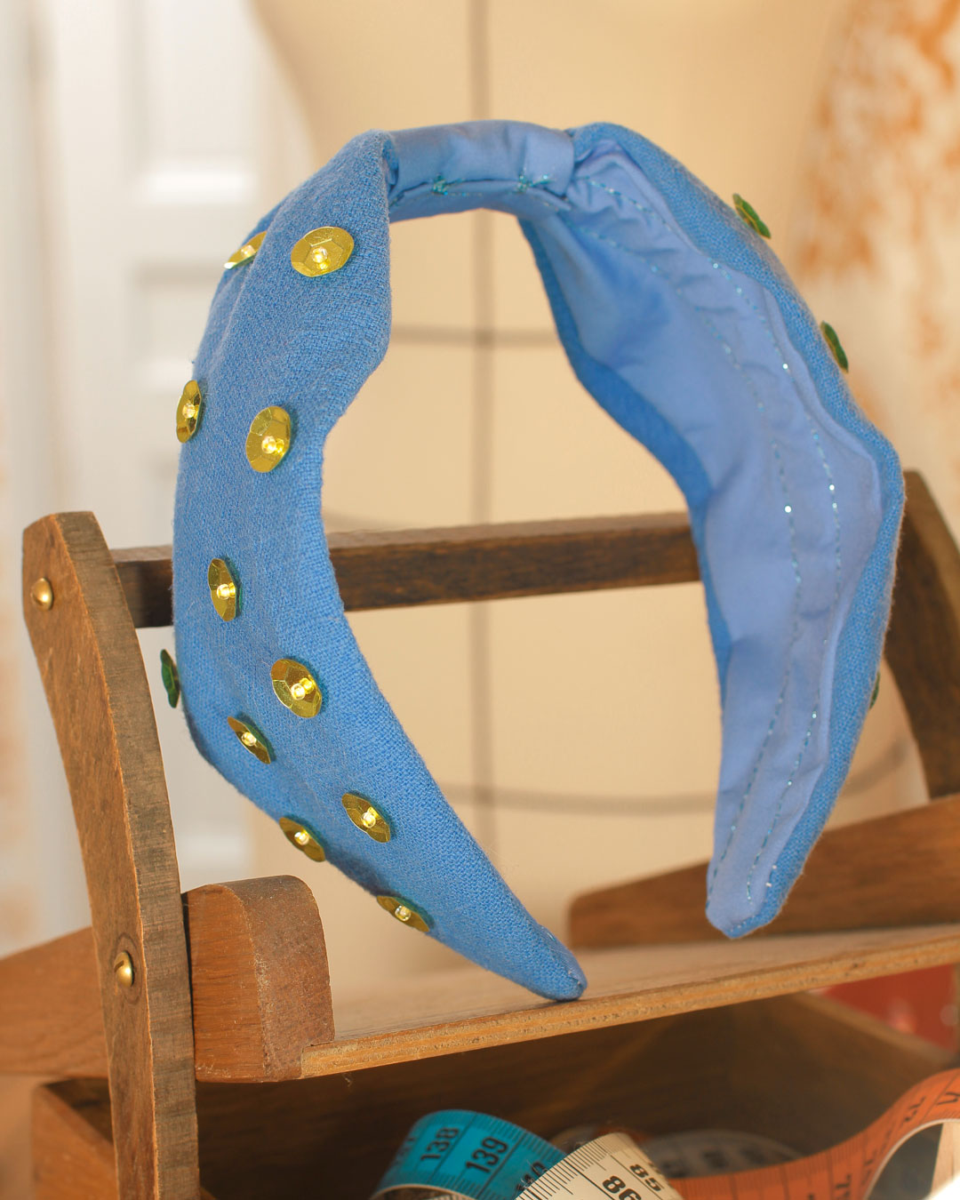 Le serre-tête Elisabeth, dans sa version Côte d’azur, est un serre-tête confectionné à partir de deux tissus : un lin bleu azur sur le dessus et un coton bleu clair sur le dessous et pour le noeud central. Orné de sequins jaune lime, il est un véritable bijou de tête et captera toute la lumière sur lui.