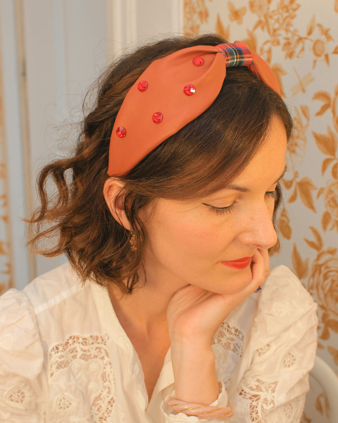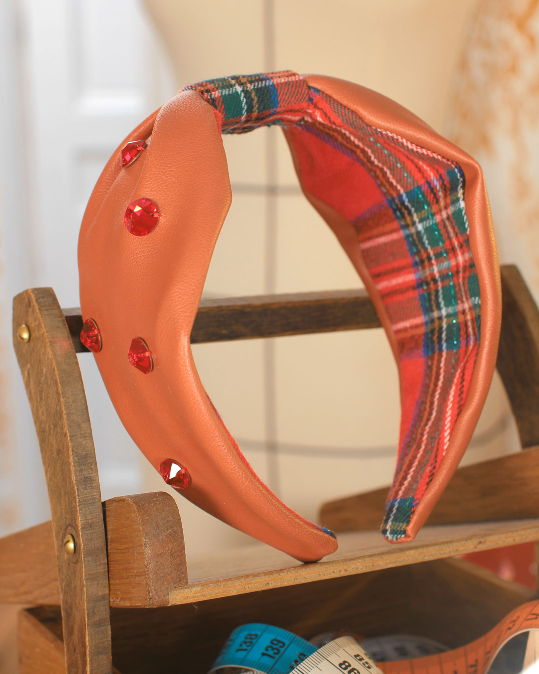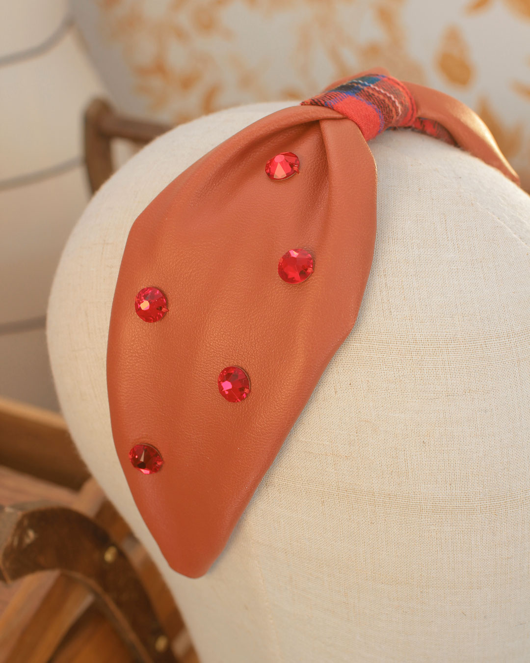 Le serre-tête Elisabeth, dans sa version Fireplace, est un serre-tête confectionné à partir de deux tissus : un simili cuir brun chaud sur le dessus et un tartan rouge, vert, bleu et blanc sur le dessous et pour le noeud central. Orné de dix cristaux autrichiens rouges, il est un véritable bijou de tête et captera toute la lumière sur lui.