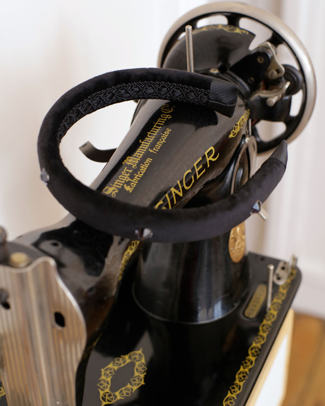 J’ai réalisé les finitions du dessous avec une passementerie noire, ton sur ton, de la célèbre marque Liberty Fabrics. Les extrémités du serre-tête sont réalisées avec du ruban gros grain noir.