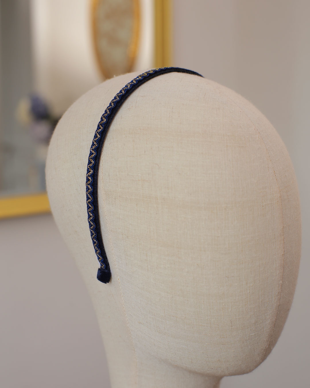 Le serre-tête Léopoldine, dans sa version bleu marine et doré, est un serre-tête en velours bleu marine foncé orné d’un croquet brillant bleu marine et doré.