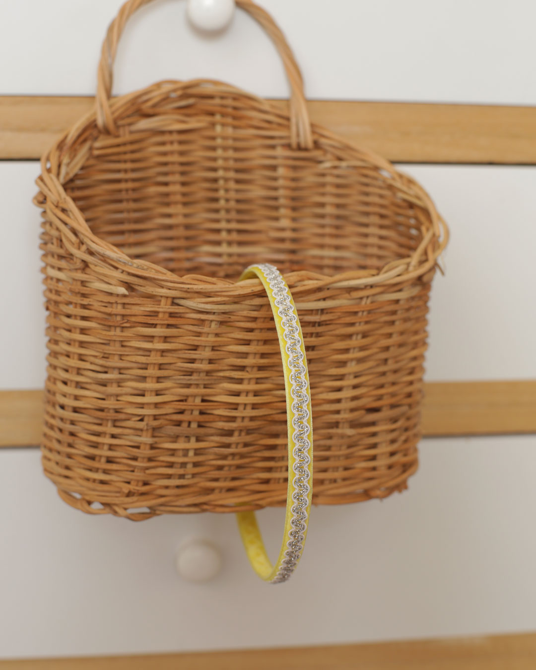 Le serre-tête Léopoldine, dans sa version jaune citron, blanc et argenté, est un serre-tête en velours jaune citron orné d’un croquet brillant blanc et argenté.