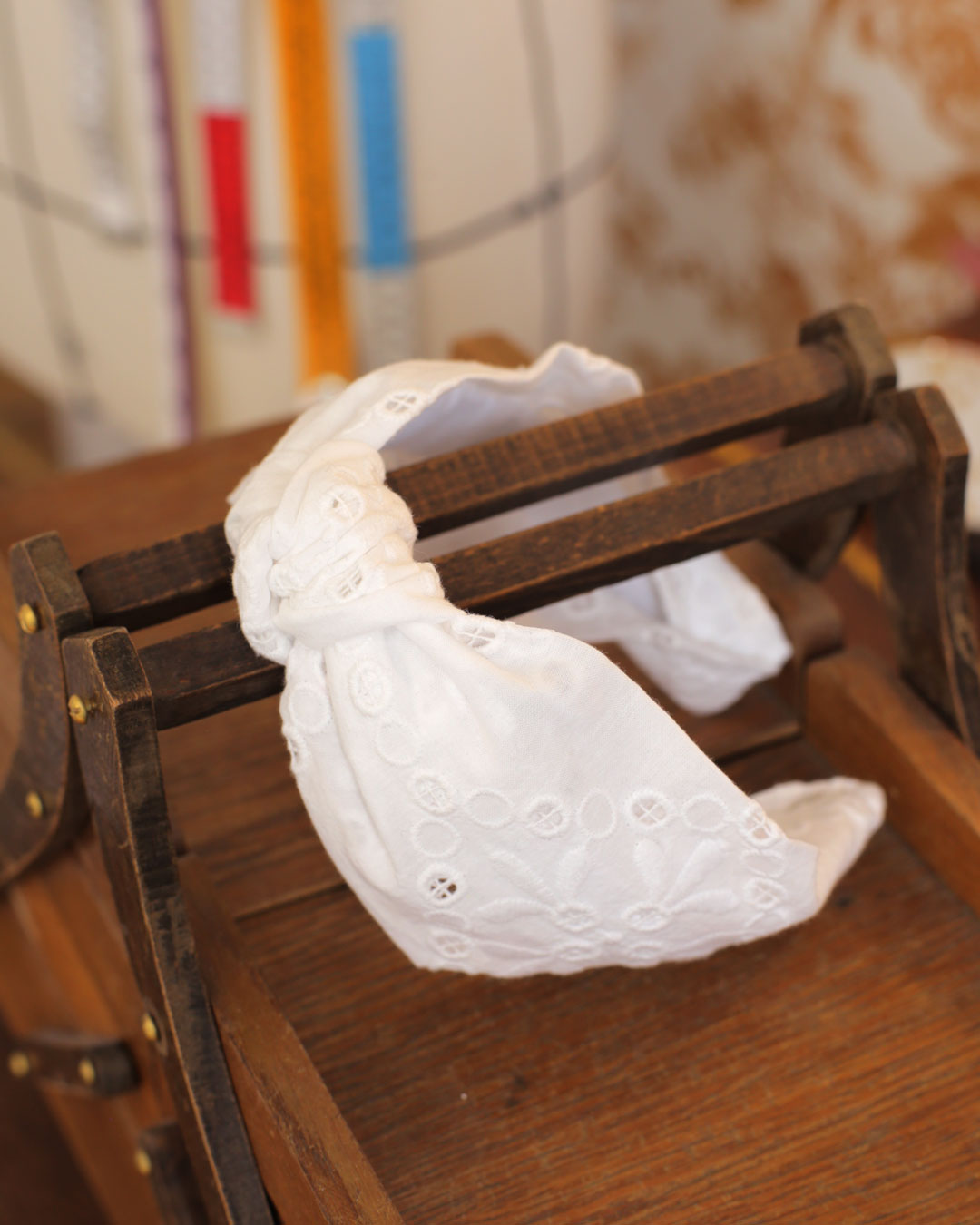 Le serre-tête Nicole, dans sa version Broderie anglaise ajourée, est un serre-tête rétro et résolument féminin.