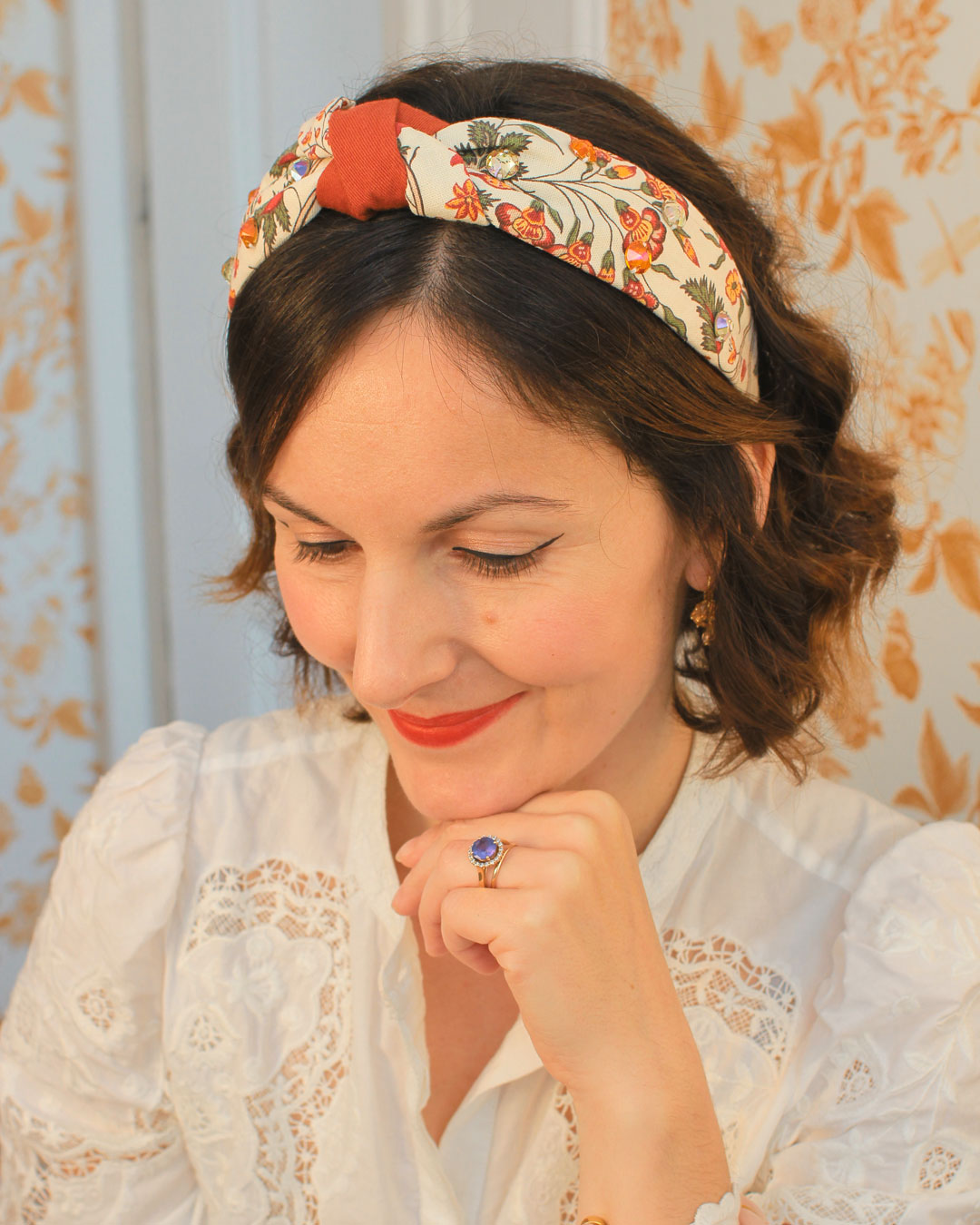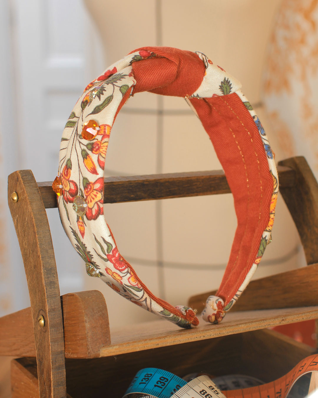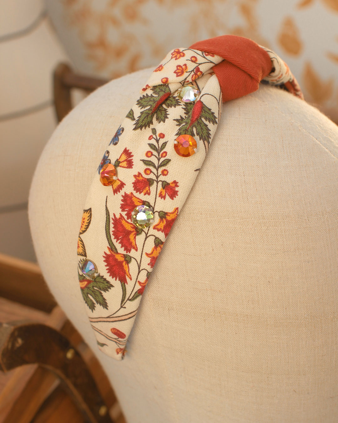 Le serre-tête Victoire, dans sa version Botanique, est un serre-tête confectionné à partir de deux tissus : un coton imprimé fleurs et feuillages dans les tons oranges, verts, bleus sur fond écru pour le dessus et un coton rouille pour le dessous. Son originalité repose sur son centre fait de noeuds entrelacés. Orné de dix cristaux autrichiens oranges et vert clair, il est un véritable bijou de tête et captera toute la lumière sur lui.